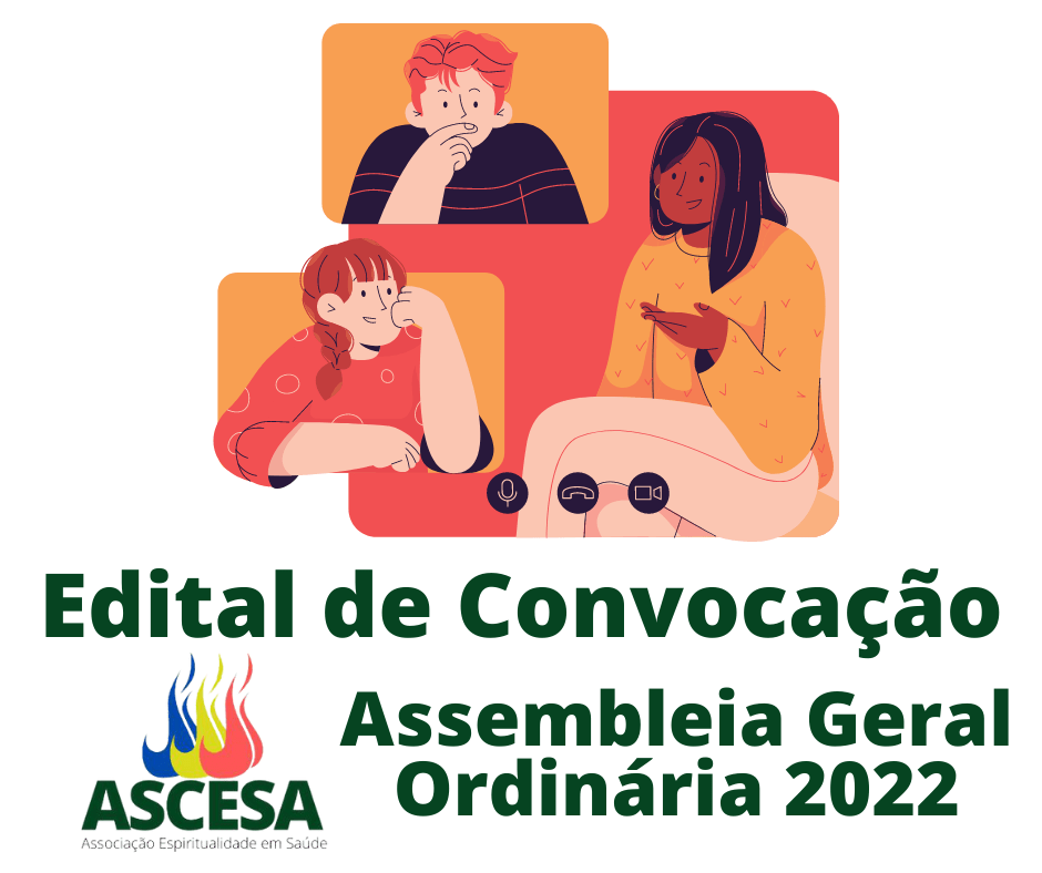 Convidamos as(os) associadas(os), os membros do Conselho Gestor e do Conselho Fiscal, colaboradoras(os) e parceiras(os) da Associação Espiritualidade em Saúde – ASCESA para, nos termos dos artigo 12 a 17 do nosso Estatuto Social, participar da Assembleia Geral Ordinária 2022, a realizar-se conforme as informações a seguir: