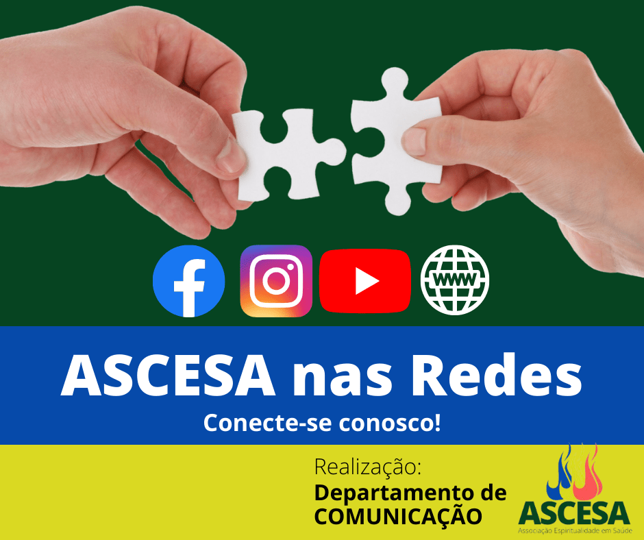 O Departamento de Comunicação da Associação Espiritualidade em Saúde – ASCESA comunica que estamos ampliando nossa presença no mundo, através das redes sociais. Conheça, curta e siga nossos canais nas redes sociais para acompanhar nosso trabalho e oportunidades de formação e reflexão sobre o trabalho de Espiritualidade em Saúde que desenvolvemos, em prol da melhoria da qualidade de vida de todas e todos.