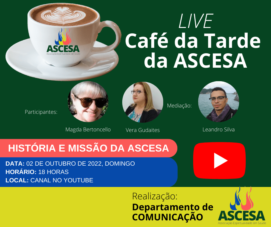 A Associação Espiritualidade em Saúde – ASCESA, através do Departamento de Comunicação, inaugura a sua programação de lives na internet. O “Café da Tarde da ASCESA” se propõe a ser um momento aconchegante de prosa através da internet sobre o trabalho que desenvolvemos e a visão de Saúde e Espiritualidade que orientam nossa missão.