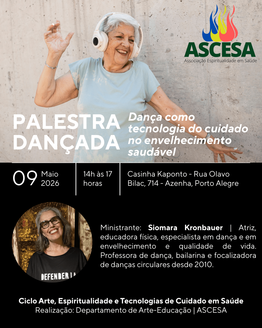 A Associação Espiritualidade em Saúde – ASCESA, através do seu Departamento de Arte-Educação, convida para a atividade “Palestra Dançada: Dança como tecnologia do cuidado no envelhecimento saudável”, atividade integrante do Ciclo Arte, Espiritualidade e Tecnologias de Cuidado em Saúde e ministrado por Siomara Kronbauer.